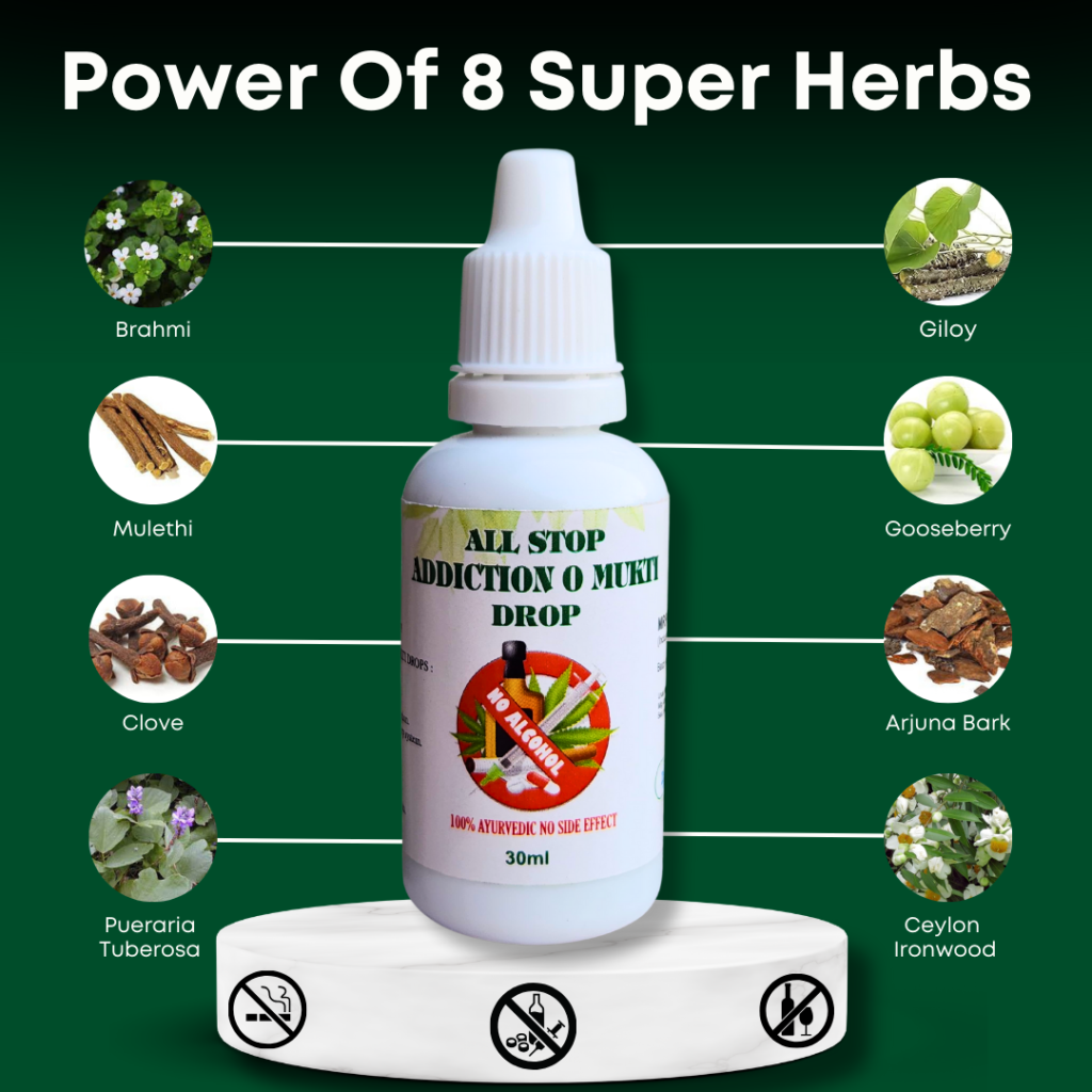 All Stop is a top-rated addiction-free drop approved by the Ministry of AYUSH, Government of India. Combining 8 powerful and rare herbs, it supports freedom from all types of addictions.